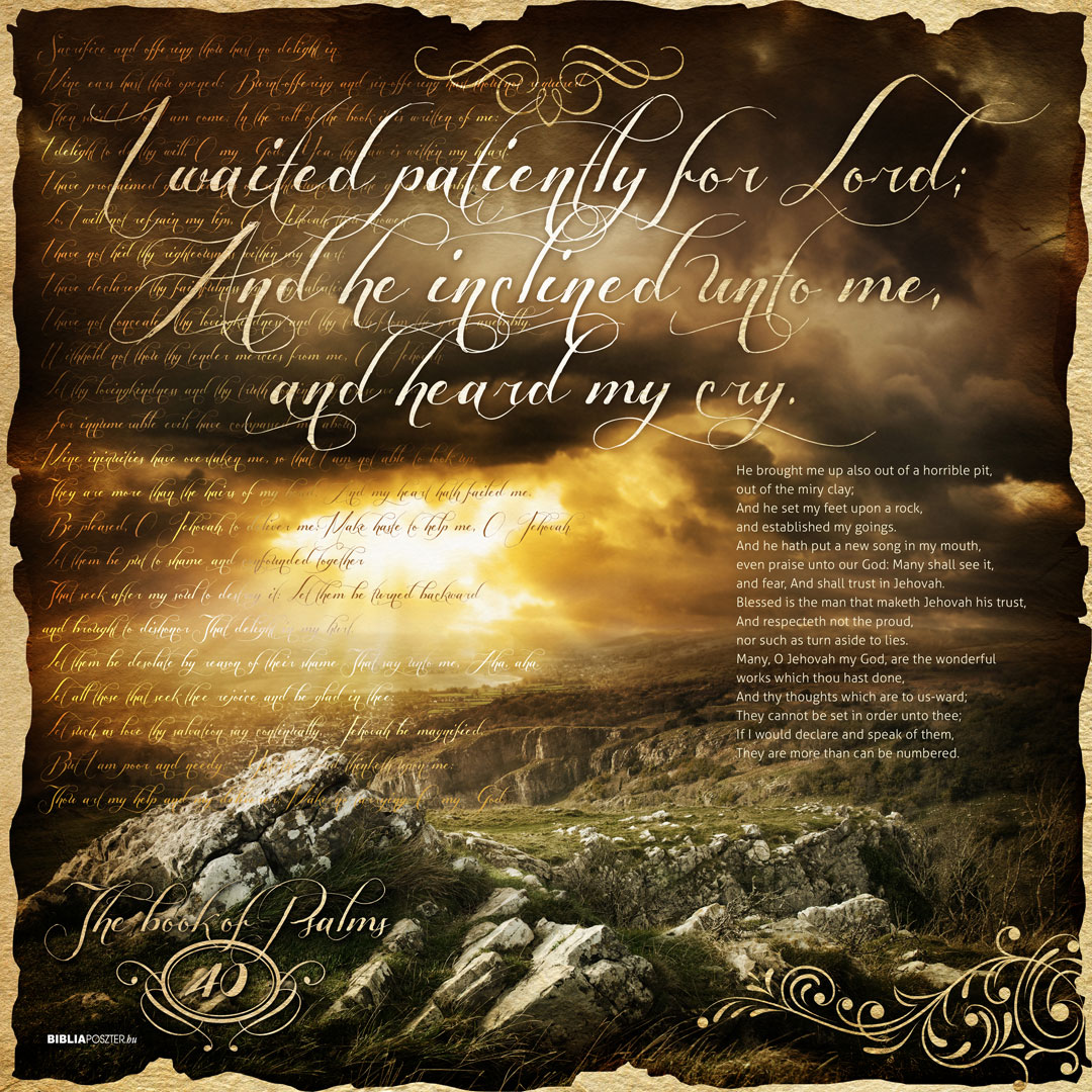 „I waited patiently for the Lord; and he inclined unto me, and heard my cry. He brought me up also out of an horrible pit, out of the miry clay, and set my feet upon a rock, and established my goings. And he hath put a new song in my mouth, even praise unto our God: many shall see it, and fear, and shall trust in the Lord. Blessed is that man that maketh the Lord his trust, and respecteth not the proud, nor such as turn aside to lies. Many, O Lord my God, are thy wonderful works which thou hast done, and thy thoughts which are to us-ward: they cannot be reckoned up in order unto thee: if I would declare and speak of them, they are more than can be numbered. Sacrifice and offering thou didst not desire; mine ears hast thou opened: burnt offering and sin offering hast thou not required. Then said I, Lo, I come: in the volume of the book it is written of me, I delight to do thy will, O my God: yea, thy law is within my heart. I have preached righteousness in the great congregation: lo, I have not refrained my lips, O Lord, thou knowest. I have not hid thy righteousness within my heart; I have declared thy faithfulness and thy salvation: I have not concealed thy lovingkindness and thy truth from the great congregation. Withhold not thou thy tender mercies from me, O Lord: let thy lovingkindness and thy truth continually preserve me. For innumerable evils have compassed me about: mine iniquities have taken hold upon me, so that I am not able to look up; they are more than the hairs of mine head: therefore my heart faileth me. Be pleased, O Lord, to deliver me: O Lord, make haste to help me. Let them be ashamed and confounded together that seek after my soul to destroy it; let them be driven backward and put to shame that wish me evil. Let them be desolate for a reward of their shame that say unto me, Aha, aha. Let all those that seek thee rejoice and be glad in thee: let such as love thy salvation say continually, The Lord be magnified. But I am poor and needy; yet the Lord thinketh upon me: thou art my help and my deliverer; make no tarrying, O my God.”