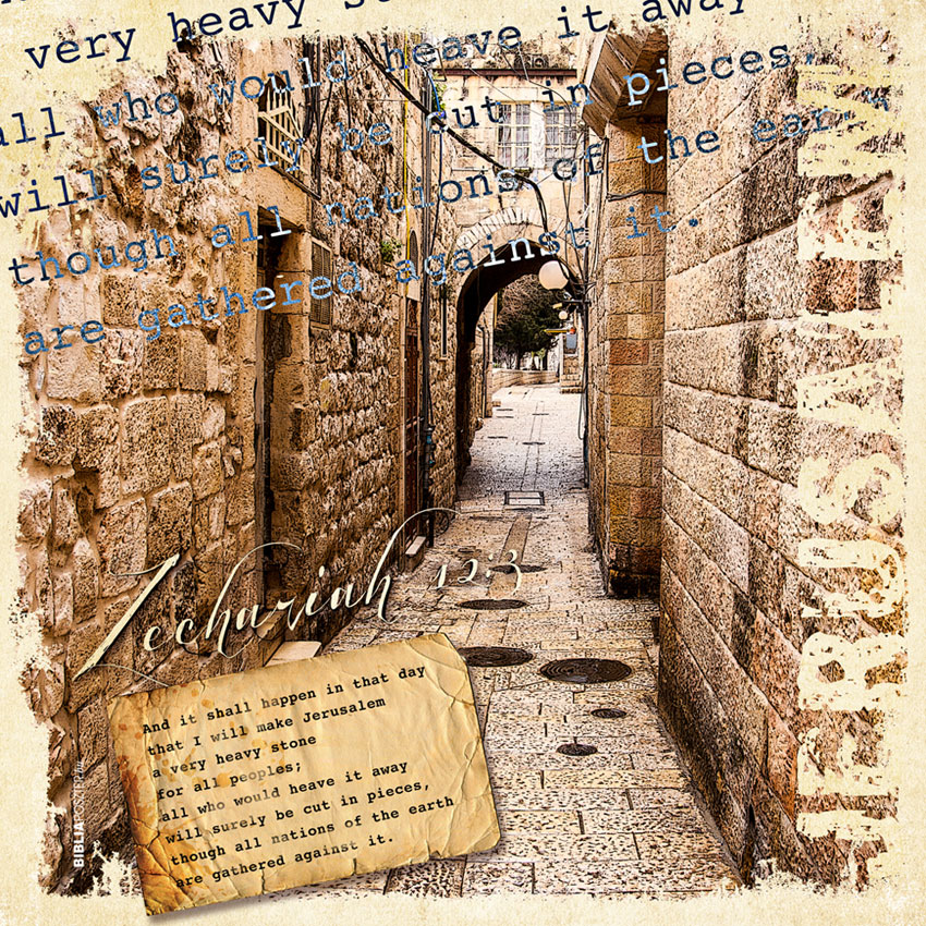 „And it shall happen in that day that I will make Jerusalem a very heavy stone for all peoples; all who would heave it away will surely be cut in pieces, though all nations of the earth are gathered against it.”