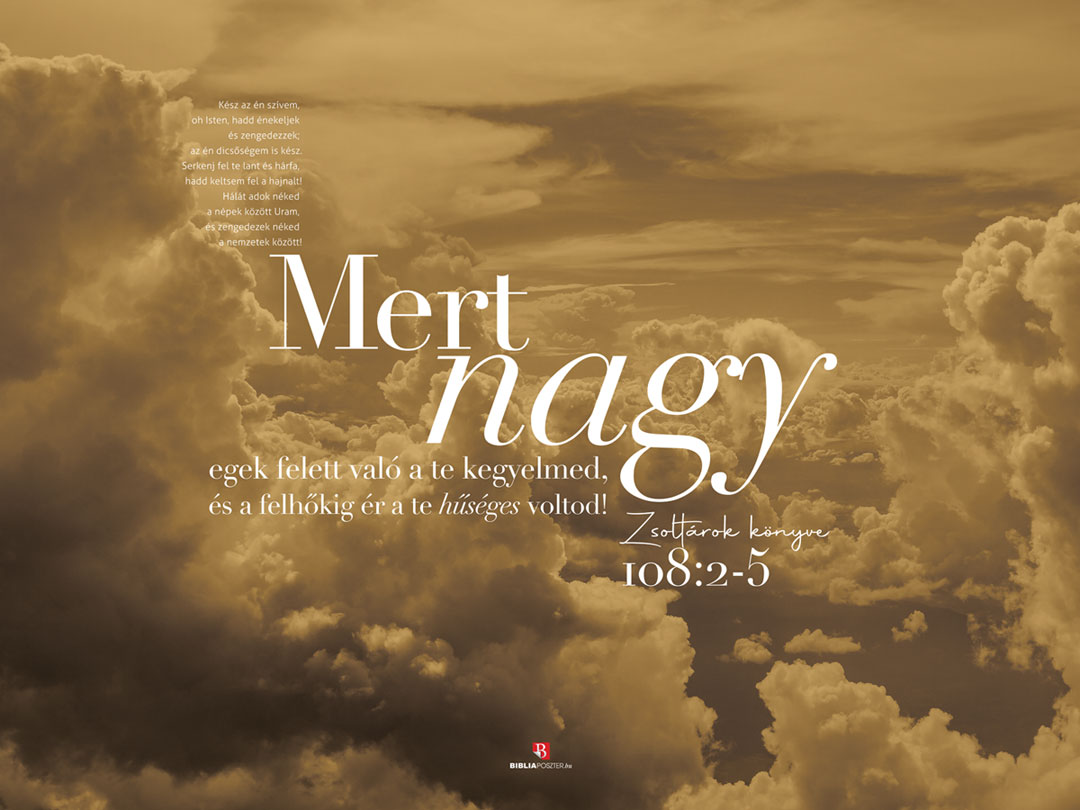„Kész az én szívem, oh Isten, hadd énekeljek és zengedezzek; az én dicsőségem is kész. Serkenj fel te lant és hárfa, hadd keltsem fel a hajnalt! Hálát adok néked a népek között Uram, és zengedezek néked a nemzetek között! Mert nagy, egek felett való a te kegyelmed, és a felhőkig ér a te hűséges voltod!”