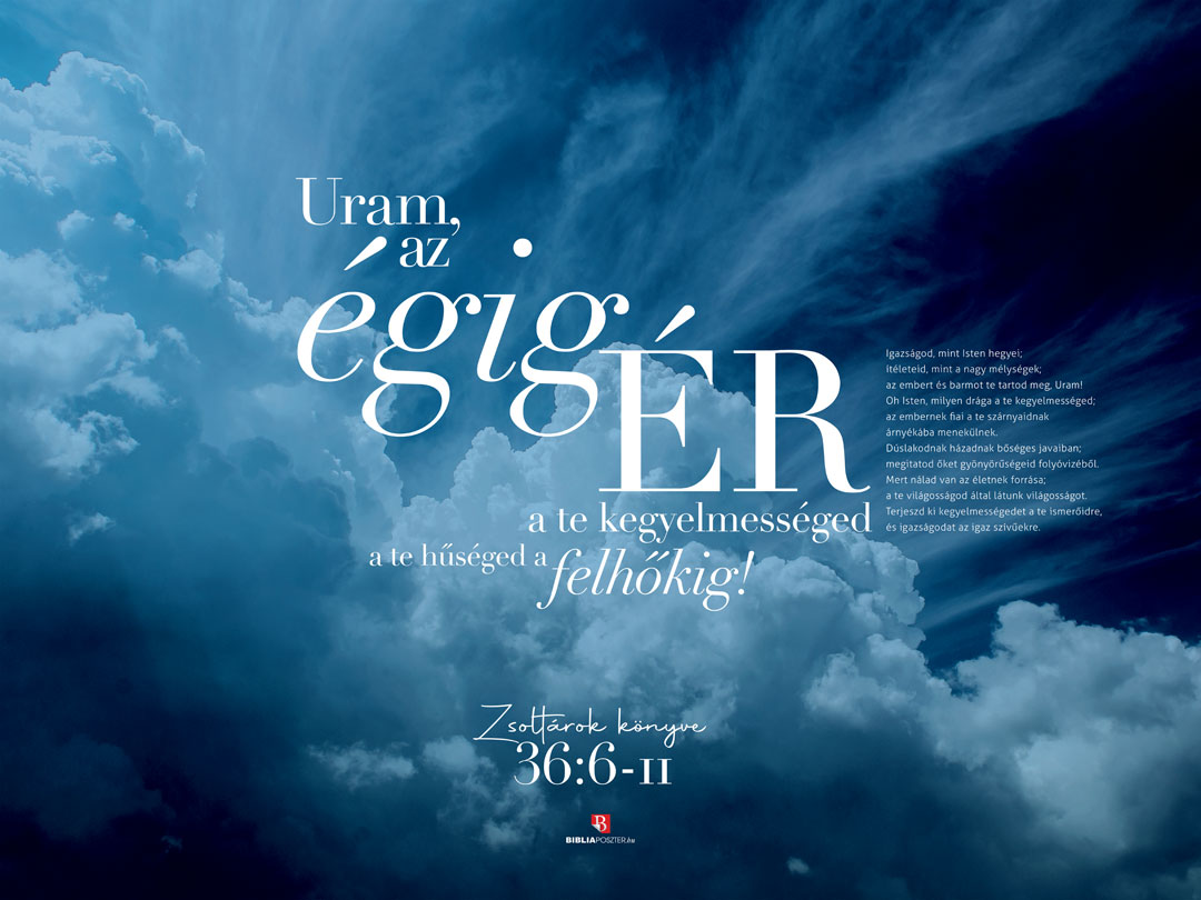 „Uram, az égig ér a te kegyelmességed; a te hűséged a felhőkig! Igazságod, mint Isten hegyei; ítéleteid, mint a nagy mélységek; az embert és barmot te tartod meg, Uram! Oh Isten, milyen drága a te kegyelmességed; az embernek fiai a te szárnyaidnak árnyékába menekülnek. Dúslakodnak házadnak bőséges javaiban; megitatod őket gyönyörűségeid folyóvizéből. Mert nálad van az életnek forrása; a te világosságod által látunk világosságot. Terjeszd ki kegyelmességedet a te ismerőidre, és igazságodat az igaz szívűekre.”