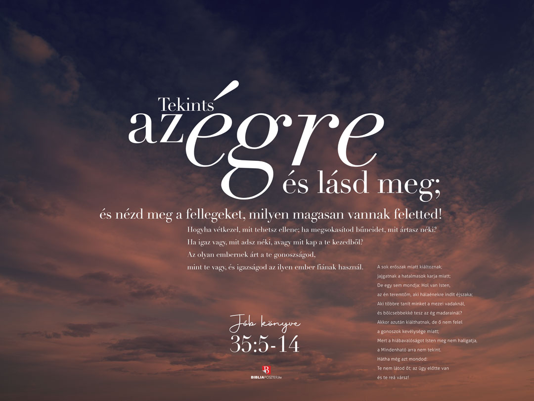 „Tekints az égre és lásd meg; és nézd meg a fellegeket, milyen magasan vannak feletted! Hogyha vétkezel, mit tehetsz ellene; ha megsokasítod bűneidet, mit ártasz néki? Ha igaz vagy, mit adsz néki, avagy mit kap a te kezedből? Az olyan embernek árt a te gonoszságod, mint te vagy, és igazságod az ilyen ember fiának használ. A sok erőszak miatt kiáltoznak; jajgatnak a hatalmasok karja miatt; De egy sem mondja: Hol van Isten, az én teremtőm, aki hálaénekre indít éjszaka; Aki többre tanít minket a mezei vadaknál, és bölcsebbekké tesz az ég madarainál? Akkor azután kiálthatnak, de ő nem felel a gonoszok kevélysége miatt; Mert a hiábavalóságot Isten meg nem hallgatja, a Mindenható arra nem tekint. Hátha még azt mondod: Te nem látod őt; az ügy előtte van és te reá vársz!”