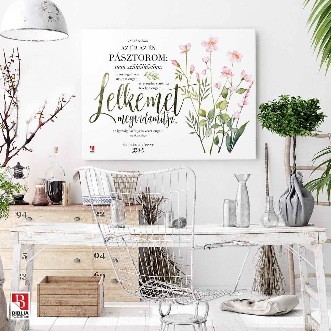 „Dávid zsoltára. Az Úr az én pásztorom; nem szűkölködöm. Fűves legelőkön nyugtat engem, és csendes vizekhez terelget engem. Lelkemet megvidámítja, az igazság ösvényein vezet engem az ő nevéért.”