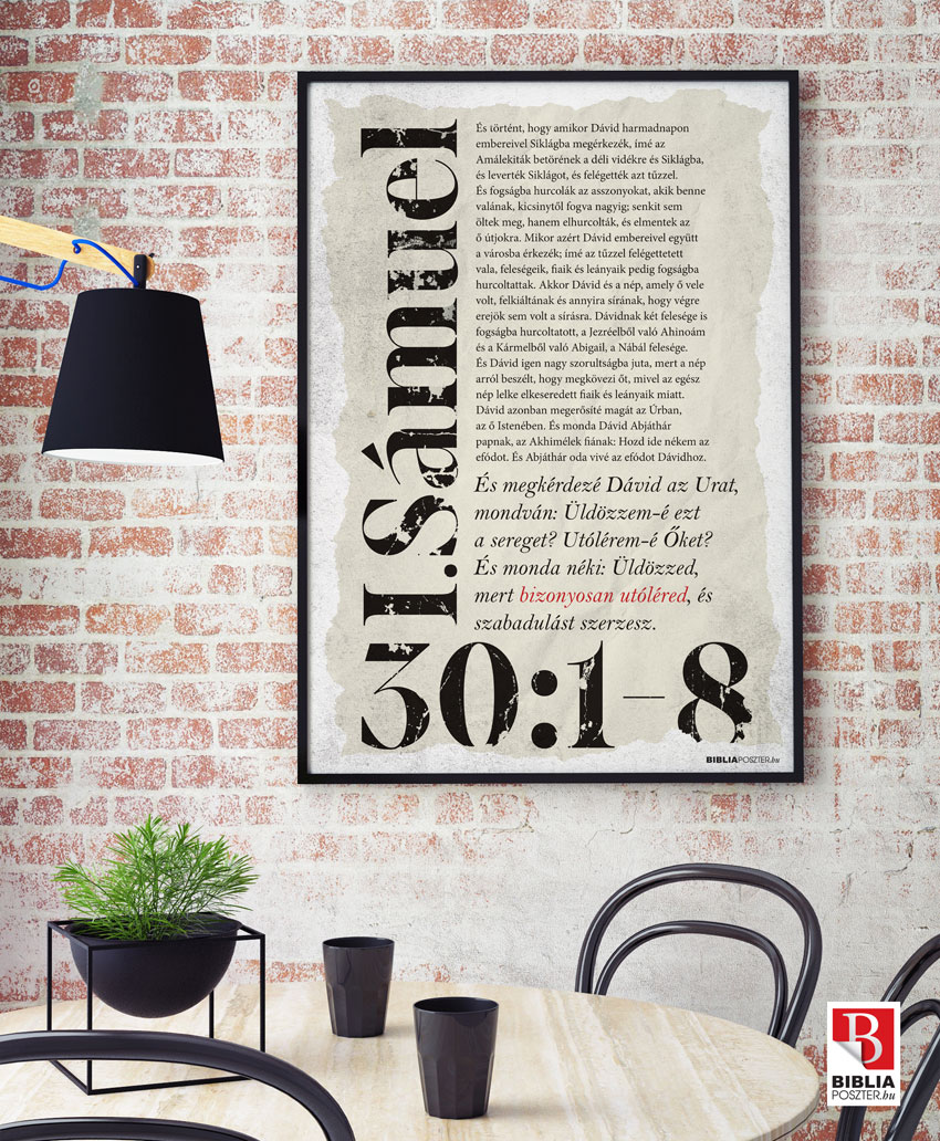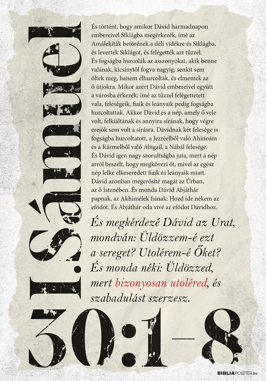 „És történt, hogy amikor Dávid harmadnapon embereivel Siklágba megérkezék, ímé az Amálekiták betörének a déli vidékre és Siklágba, és leverték Siklágot, és felégették azt tűzzel. És fogságba hurcolák az asszonyokat, akik benne valának, kicsinytől fogva nagyig; senkit sem öltek meg, hanem elhurcolták, és elmentek az ő útjokra. Mikor azért Dávid embereivel együtt a városba érkezék; ímé az tűzzel felégettetett vala, feleségeik, fiaik és leányaik pedig fogságba hurcoltattak. Akkor Dávid és a nép, amely ő vele volt, felkiáltának és annyira sírának, hogy végre erejök sem volt a sírásra. Dávidnak két felesége is fogságba hurcoltatott, a Jezréelből való Ahinoám és a Kármelből való Abigail, a Nábál felesége. És Dávid igen nagy szorultságba juta, mert a nép arról beszélt, hogy megkövezi őt, mivel az egész nép lelke elkeseredett fiaik és leányaik miatt. Dávid azonban megerősíté magát az Úrban, az ő Istenében. És monda Dávid Abjáthár papnak, az Akhimélek fiának: Hozd ide nékem az efódot. És Abjáthár oda vivé az efódot Dávidhoz. És megkérdezé Dávid az Urat, mondván: Üldözzem-é ezt a sereget? Utolérem-é őket? És monda néki: Üldözzed, mert bizonyosan utoléred, és szabadulást szerzesz.”