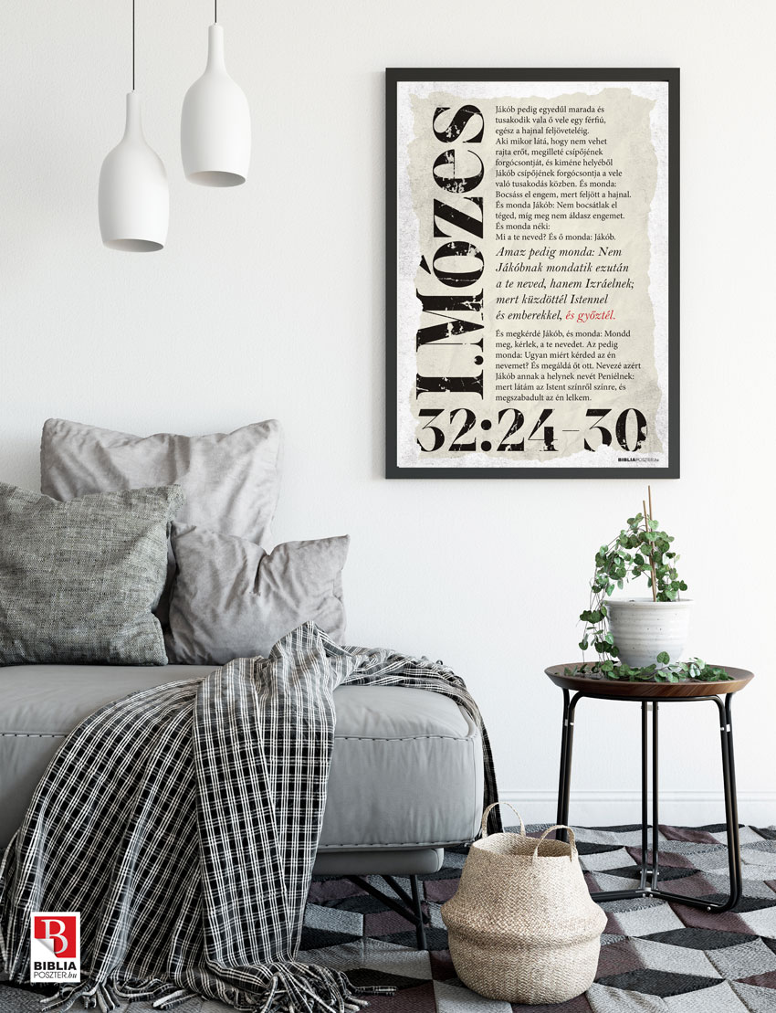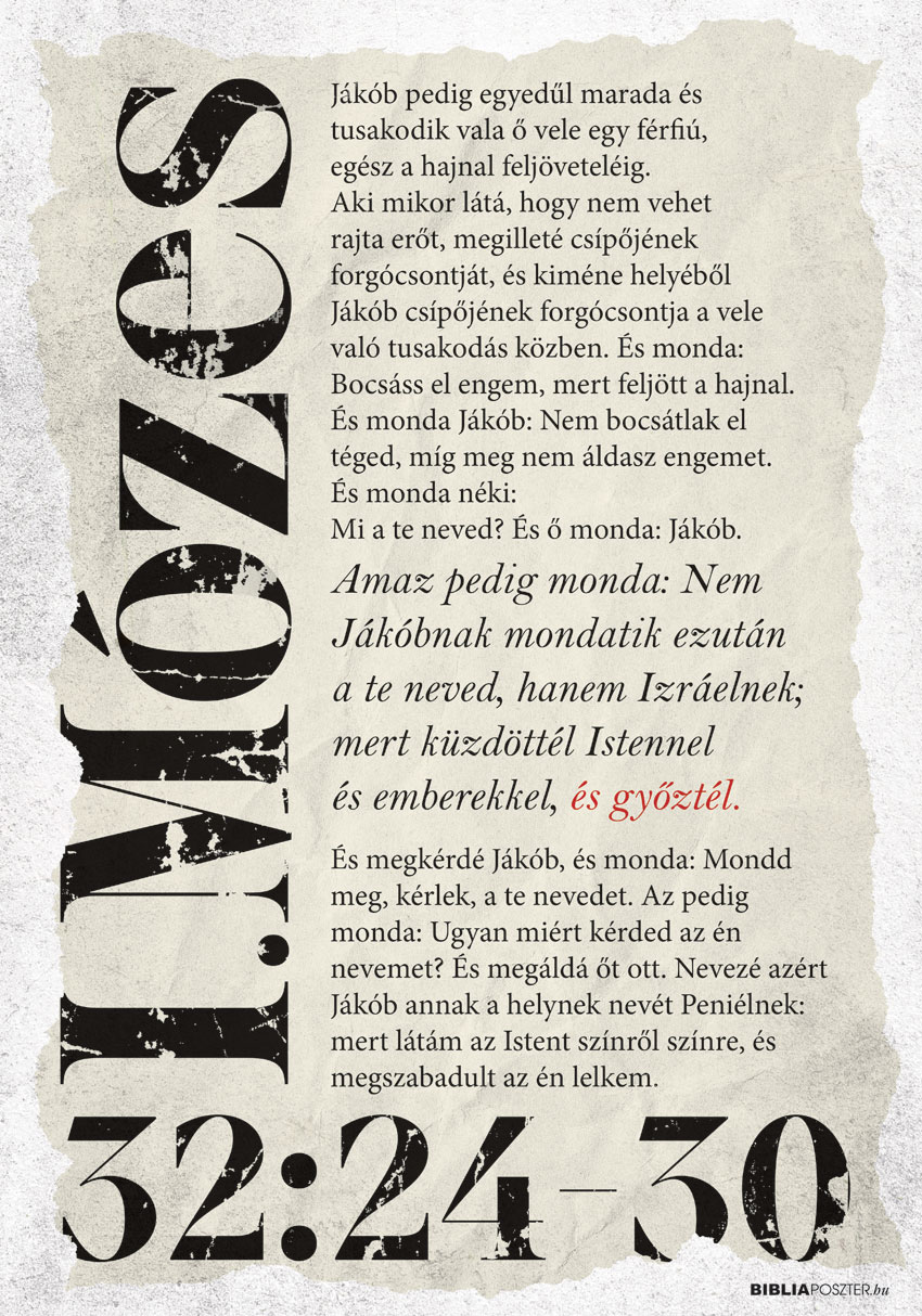 „Jákób pedig egyedűl marada és tusakodik vala ő vele egy férfiú, egész a hajnal feljöveteléig. Aki mikor látá, hogy nem vehet rajta erőt, megilleté csípőjének forgócsontját, és kiméne helyéből Jákób csípőjének forgócsontja a vele való tusakodás közben. És monda: Bocsáss el engem, mert feljött a hajnal. És monda Jákób: Nem bocsátlak el téged, míg meg nem áldasz engemet. És monda néki: Mi a te neved? És ő monda: Jákób. Amaz pedig monda: Nem Jákóbnak mondatik ezután a te neved, hanem Izráelnek; mert küzdöttél Istennel és emberekkel, és győztél. És megkérdé Jákób, és monda: Mondd meg, kérlek, a te nevedet. Az pedig monda: Ugyan miért kérded az én nevemet? És megáldá őt ott. Nevezé azért Jákób annak a helynek nevét Peniélnek: mert látám az Istent színről színre, és megszabadult az én lelkem.”