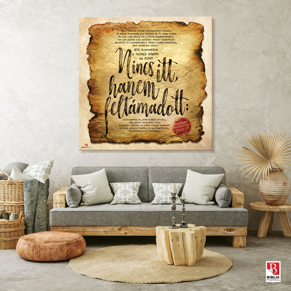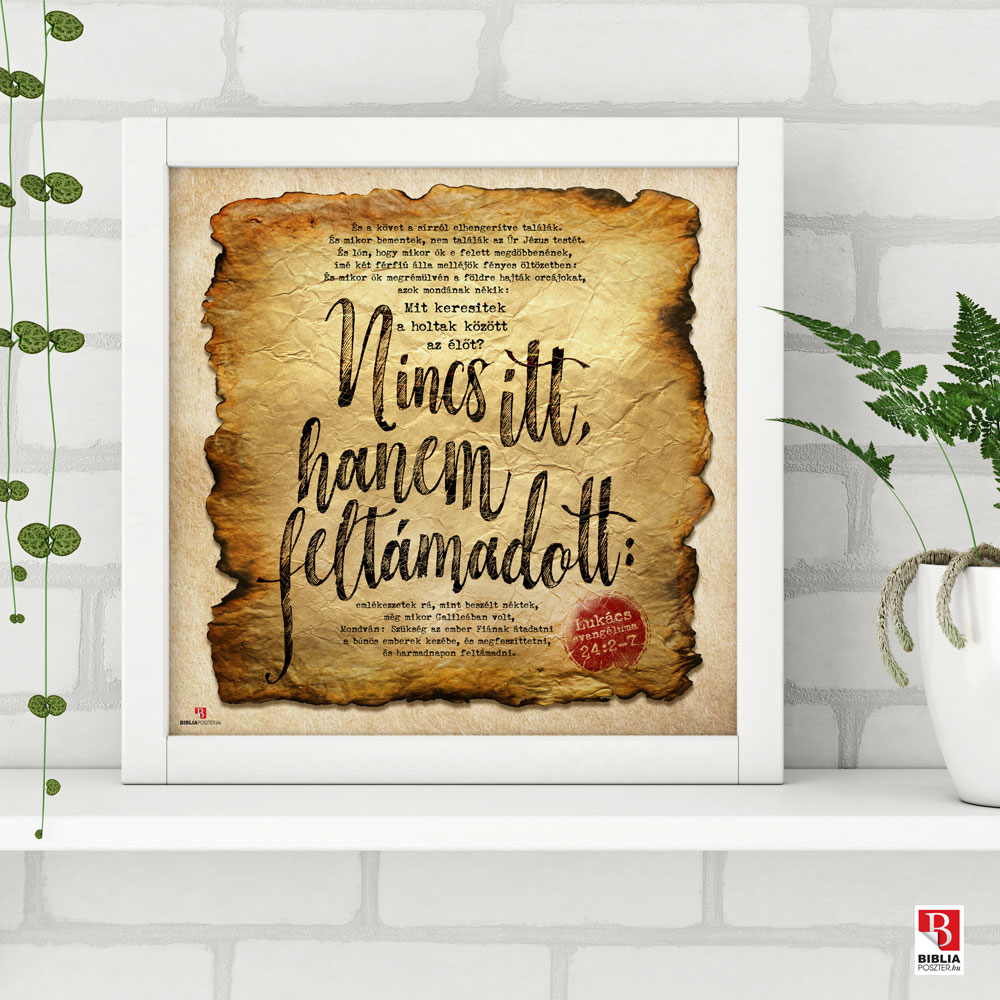 „És a követ a sírról elhengerítve találák. És mikor bementek, nem találák az Úr Jézus testét. És lőn, hogy mikor ők e felett megdöbbenének, ímé két férfiú álla melléjök fényes öltözetben: És mikor ők megrémülvén a földre hajták orcájokat, azok mondának nékik: Mit keresitek a holtak között az élőt? Nincs itt, hanem feltámadott: emlékezzetek rá, mint beszélt néktek, még mikor Galileában volt, Mondván: Szükség az ember Fiának átadatni a bűnös emberek kezébe, és megfeszíttetni, és harmadnapon feltámadni.”