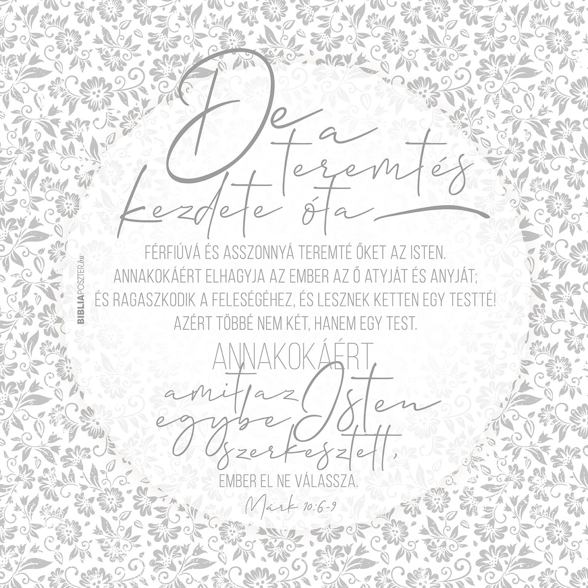 „De a teremtés kezdete óta férfiúvá és asszonnyá teremté őket az Isten. Annakokáért elhagyja az ember az ő atyját és anyját; és ragaszkodik a feleségéhez, És lesznek ketten egy testté! Azért többé nem két, hanem egy test. Annakokáért amit az Isten egybe szerkesztett, ember el ne válassza.;”
