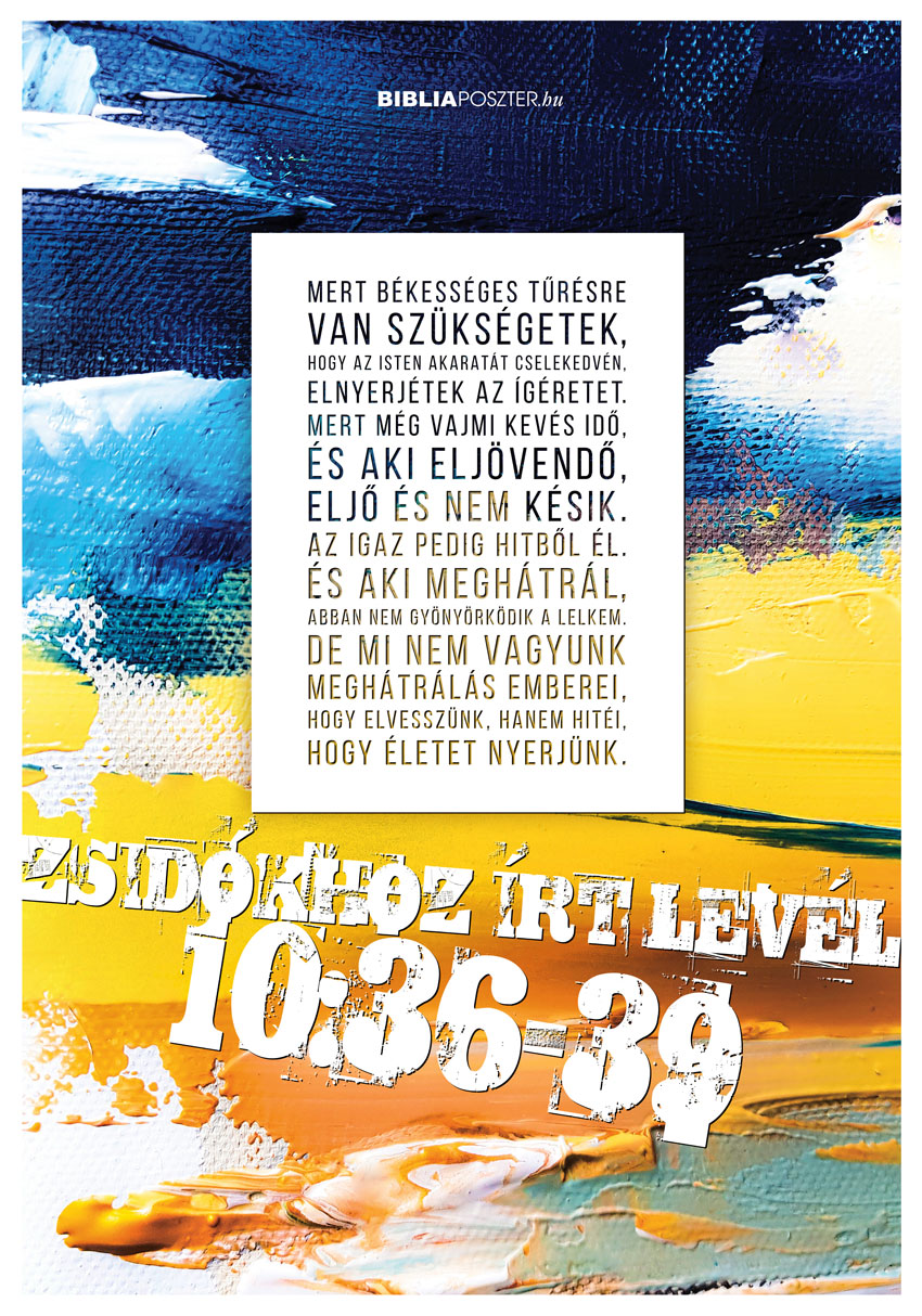 „Mert békességes tűrésre van szükségetek, hogy az Isten akaratát cselekedvén, elnyerjétek az ígéretet. Mert még vajmi kevés idő, és aki eljövendő, eljő és nem késik. Az igaz pedig hitből él. És aki meghátrál, abban nem gyönyörködik a lelkem. De mi nem vagyunk meghátrálás emberei, hogy elvesszünk, hanem hitéi, hogy életet nyerjünk.;”