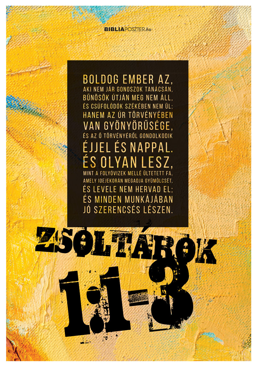 „Boldog ember az, aki nem jár gonoszok tanácsán, bűnösök útján meg nem áll, és csúfolódók székében nem ül; Hanem az Úr törvényében van gyönyörűsége, és az ő törvényéről gondolkodik éjjel és nappal. És olyan lesz, mint a folyóvizek mellé ültetett fa, amely idejekorán megadja gyümölcsét, és levele nem hervad el; és minden munkájában jó szerencsés lészen.;”