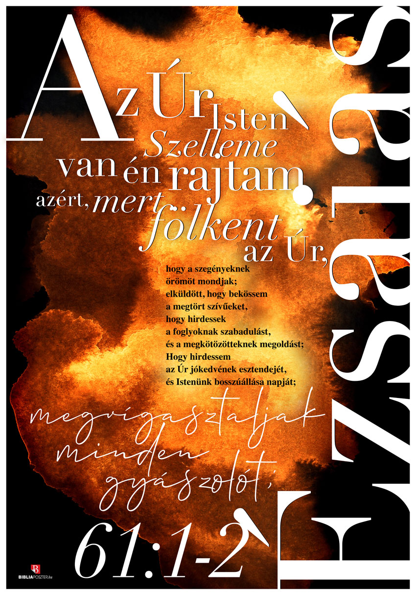 „Az Úr Isten Szelleme van én rajtam azért, mert fölkent engem az Úr, hogy a szegényeknek örömöt mondjak; elküldött, hogy bekössem a megtört szívűeket, hogy hirdessek a foglyoknak szabadulást, és a megkötözötteknek megoldást; Hogy hirdessem az Úr jókedvének esztendejét, és Istenünk bosszúállása napját; megvígasztaljak minden gyászolót.;”