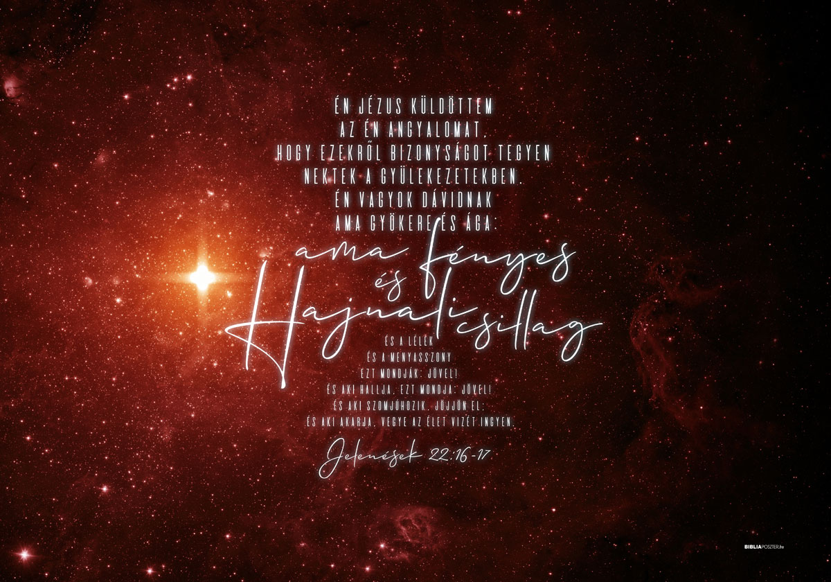 „Én Jézus küldöttem az én angyalomat, hogy ezekről bizonyságot tegyen nektek a gyülekezetekben. Én vagyok Dávidnak ama gyökere és ága: ama fényes és hajnali csillag. És a Lélek és a menyasszony ezt mondják: Jövel! És aki hallja, ezt mondja: Jövel! És aki szomjúhozik, jöjjön el; és aki akarja, vegye az élet vizét ingyen.”